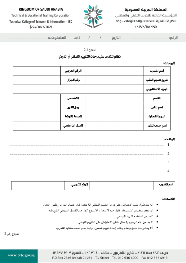 ويرفق المتدرب عبر هذا الايميل الأخير إشعار التحويل وتعبئة وارفاق النموذج المرفق هنا الخاص بالاعتراض على التقييم النهائي.